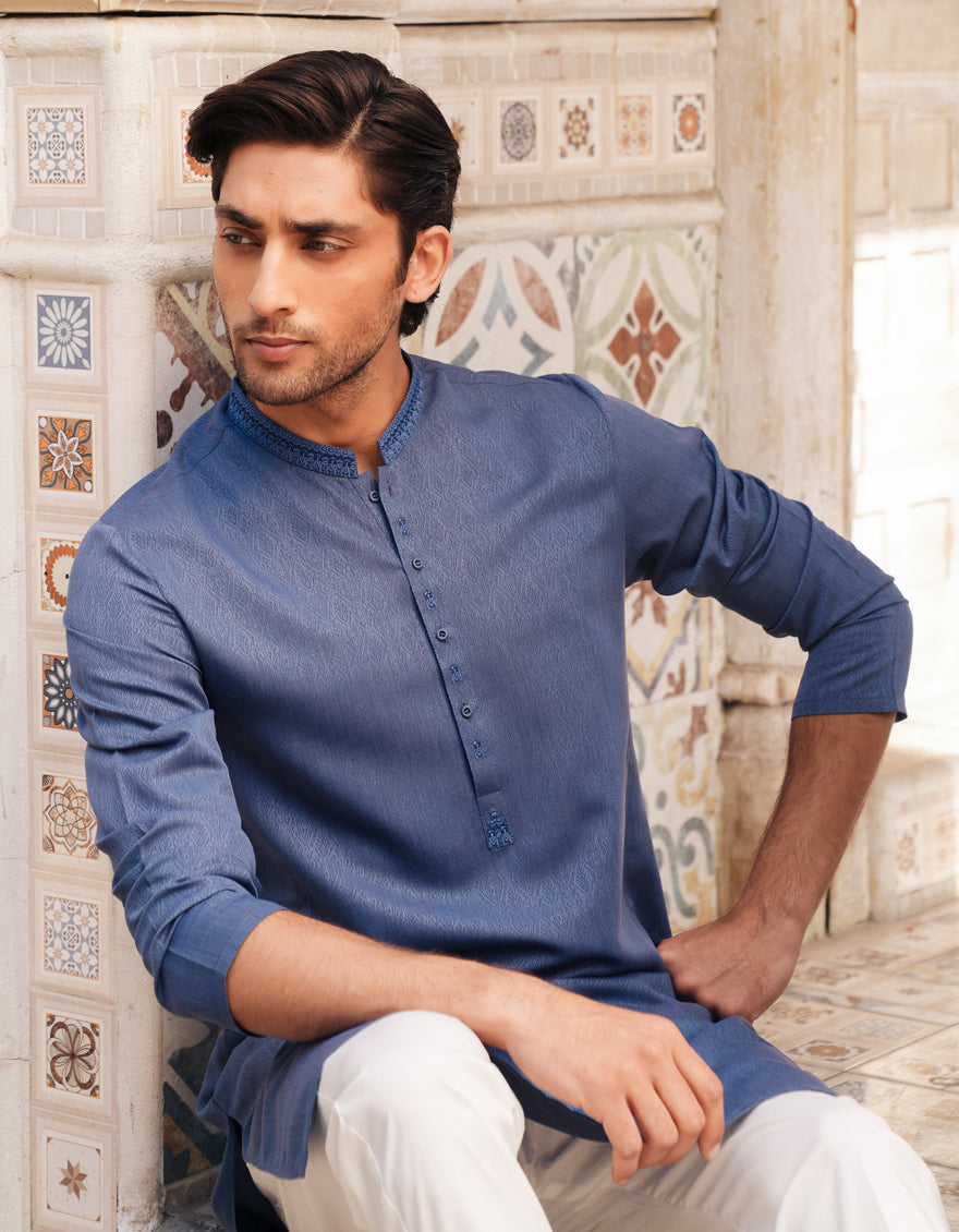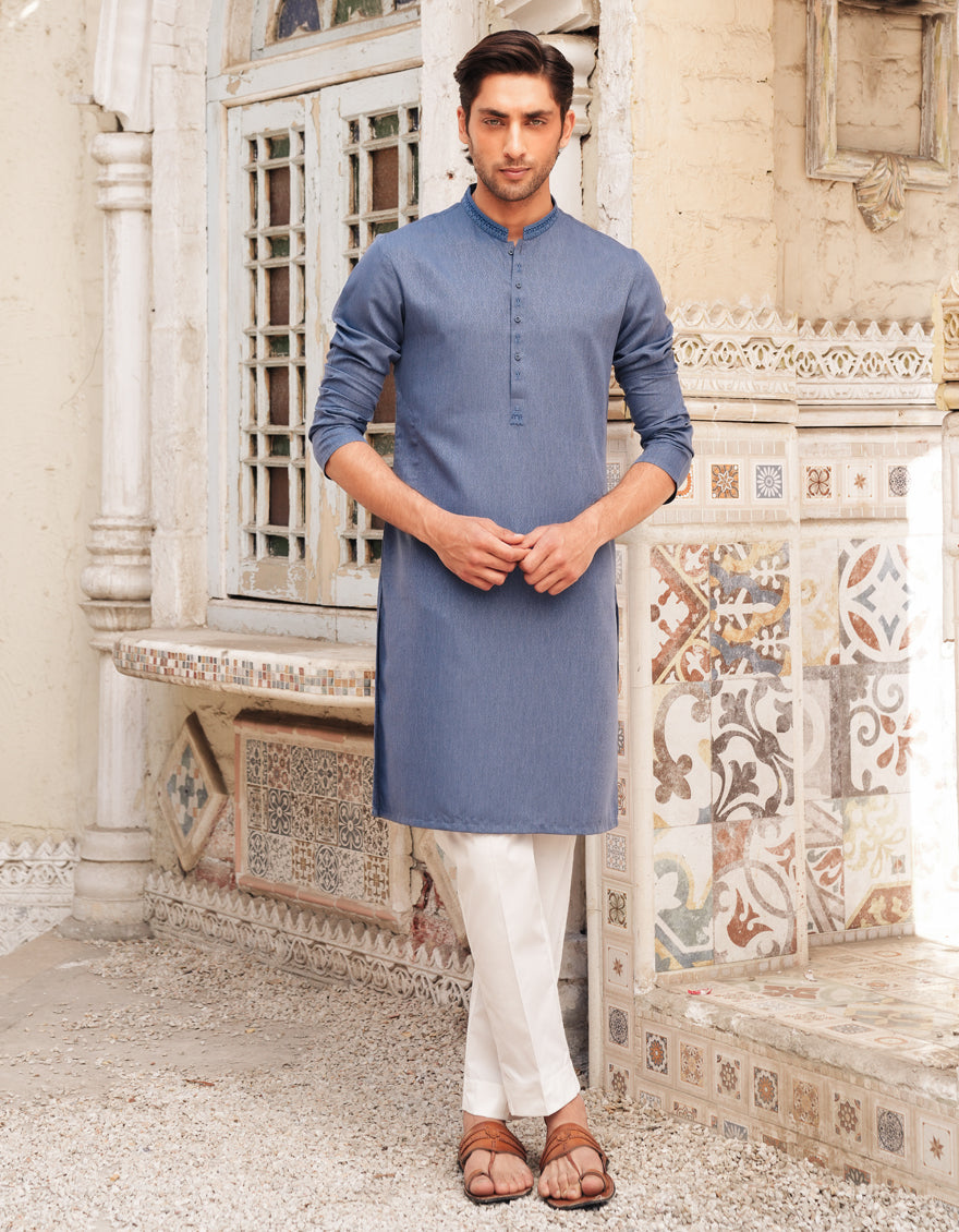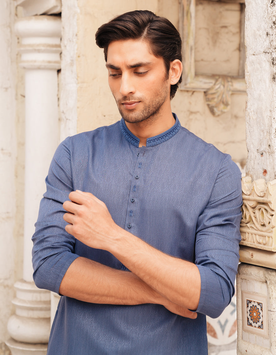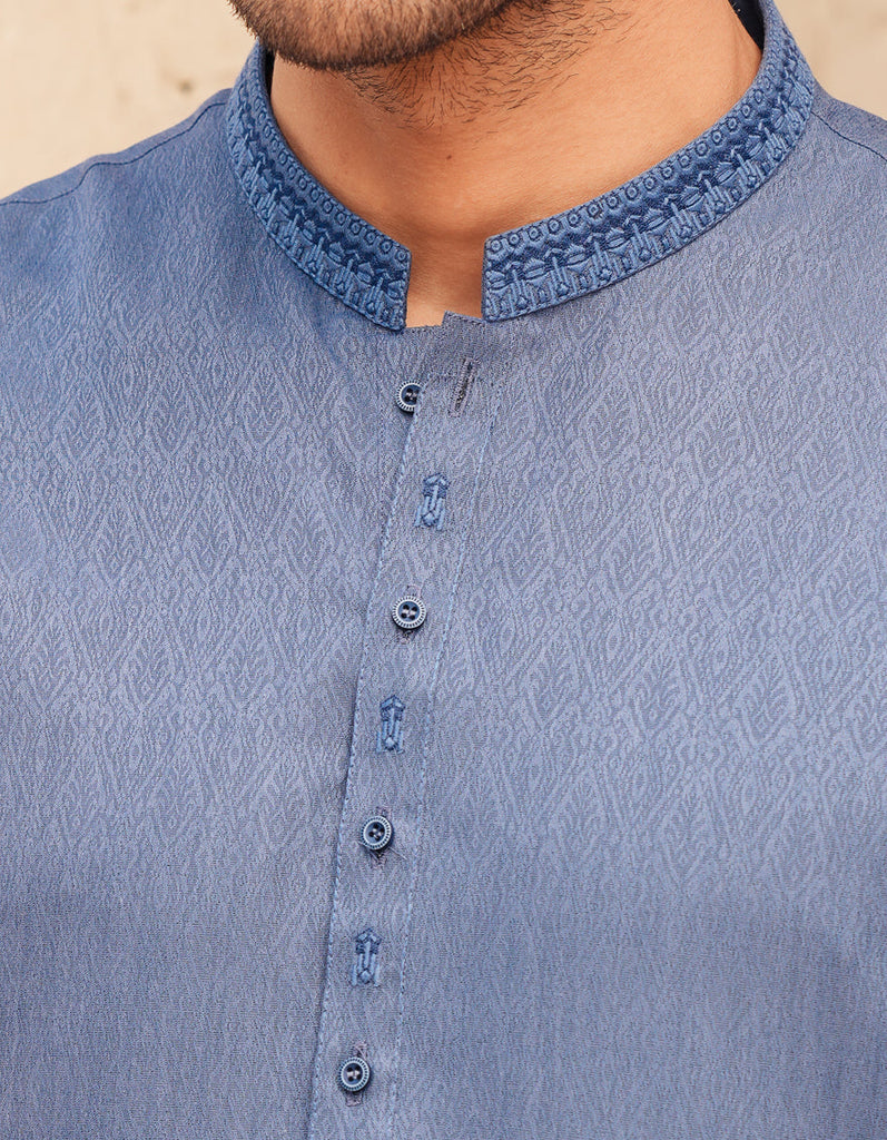 Upgrade your look with this Dull Blue Blended Semi-Formal Kurta, which mixes traditional and modern styles for a classy yet comfortable outfit.
