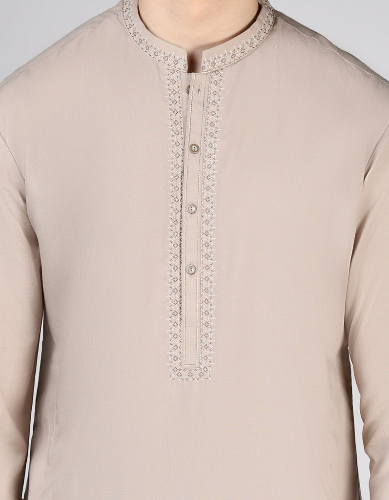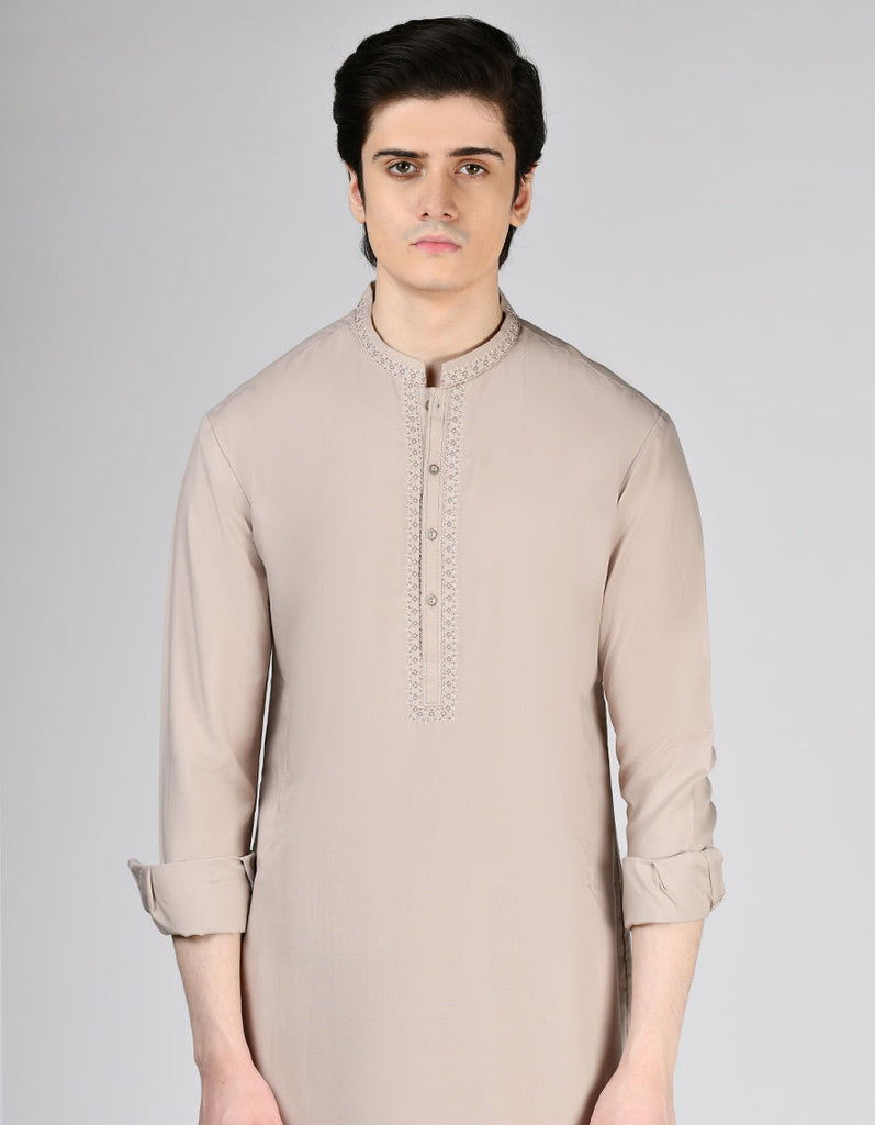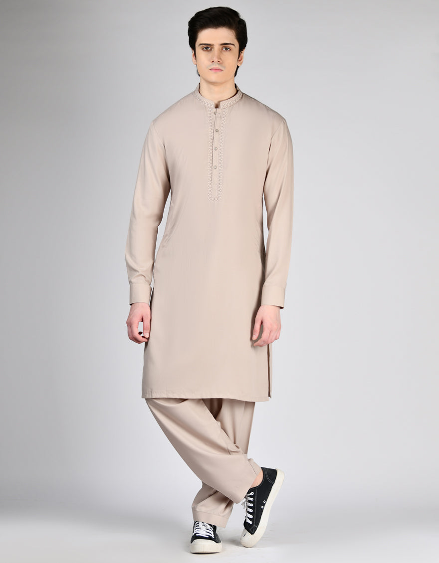 A perfect fusion of tradition and contemporary fashion, this Tea pink blended kameez shalwar for teen boys exudes effortless style. Its classic appeal offers versatility, suitable for a wide range of events and environments.