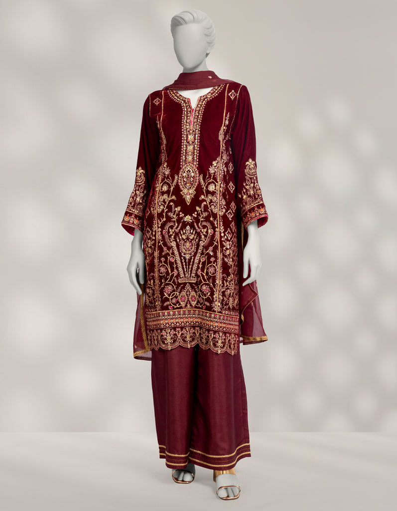 MAROON VELVET 3PC STITCHED | JJPW-W-JPS-25-3955 FB/INARA-02