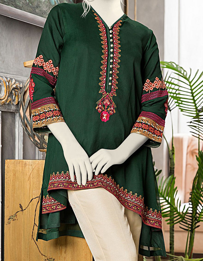 Hi-Lo Trendy Chiffon Kurta With Colorful Sleek Embroidery On Neckline, Sleeves And Shirt Border. Detailings Of Pearl Buttons On Neckline.