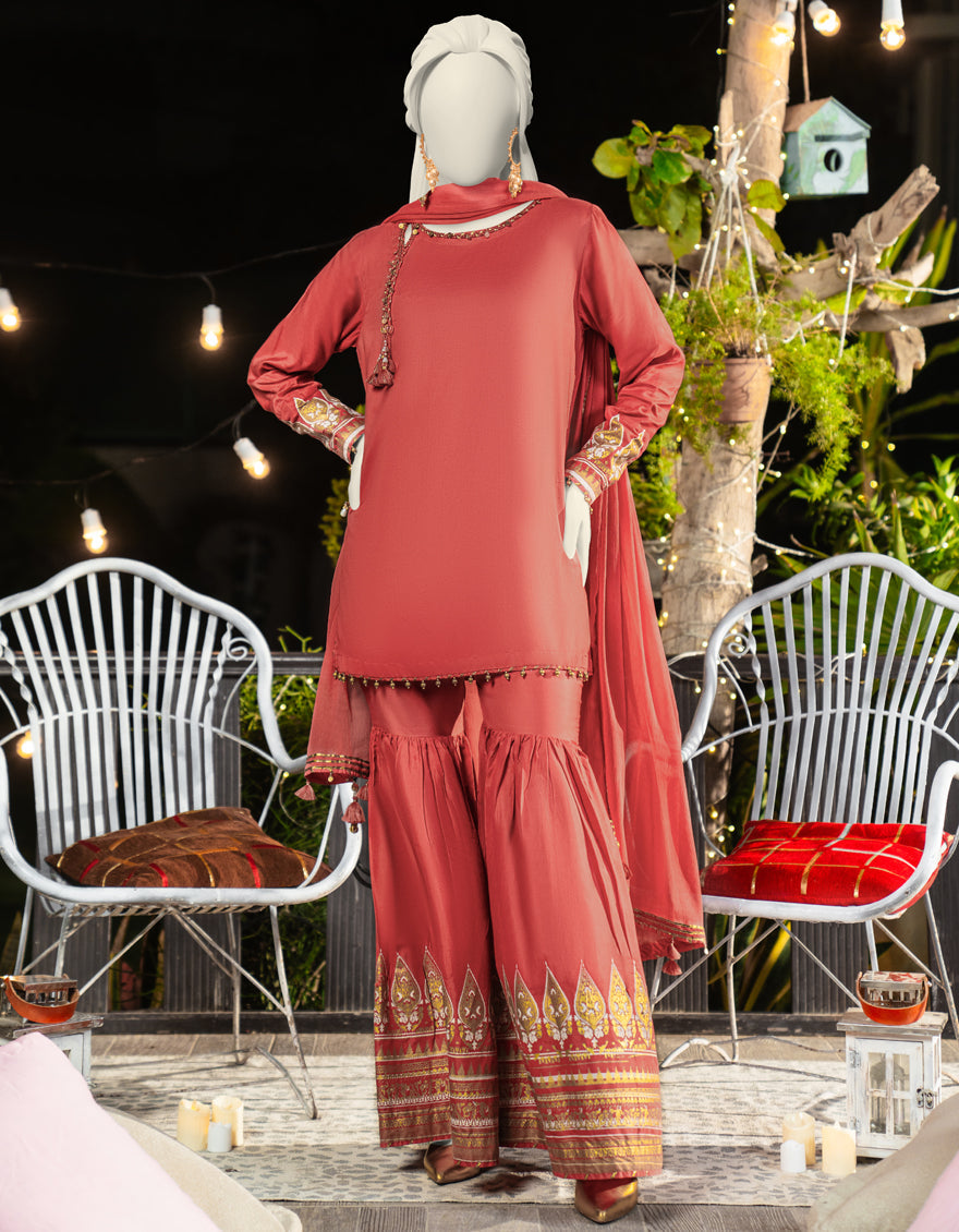 Collection: Dyed Maple Silk Shirt With Digital & Foil Border - Dyed Maple Silk Trouser - Dyed Bamber Chiffon Dupatta